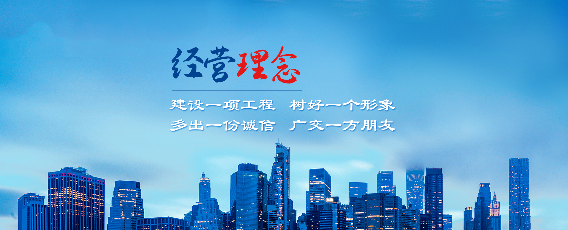 公司以建造合格建筑產品、助力國家建設為使命,以構建幸福企業為愿景。公司深知助力國家建設為使命所擔負的責任,故以“如履薄冰、如臨深淵、高調精細做事、低調謙虛做人”為工作理念,建立了完善的管理制度和質量保障體系,以人為本,構建和諧環境。公司牢固樹立安全意識、文明意識、質量意識、環境意識和精品意識。在公司質量管理過程中貫徹“雙百”方針:即工程合格率100%,客戶滿意率100%。以“建設一項工程,樹好一個形象,多出一份誠信,廣交一方朋友”為公司經營理念。